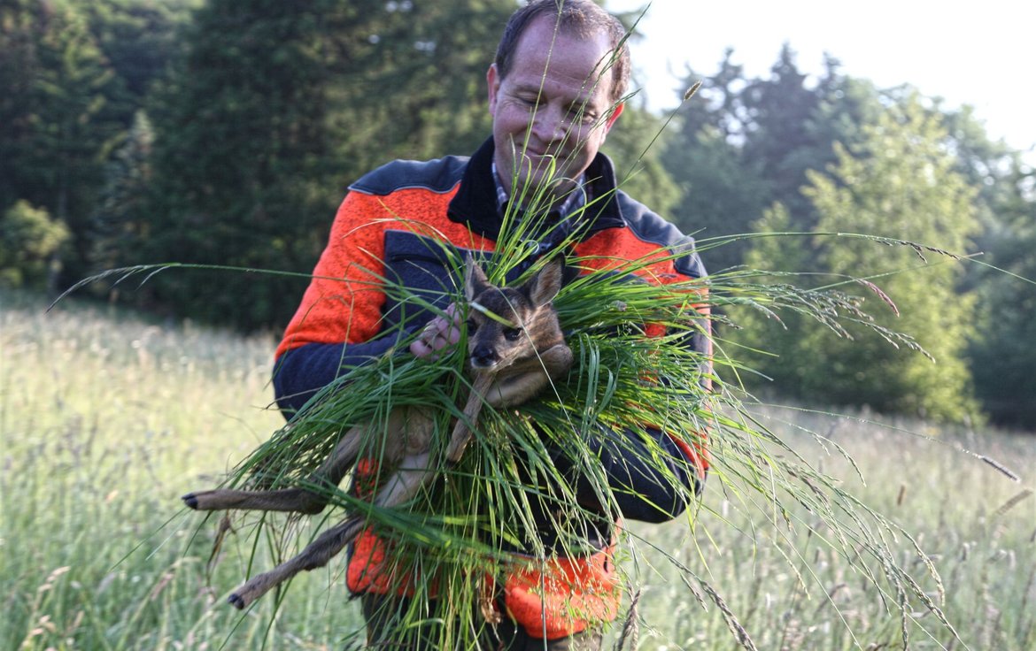 Ist ein Kitz gefunden, wird es mit viel Gras hochgehoben, damit es keinen menschlichen Geruch annimmt, und an den Feldrand getragen.